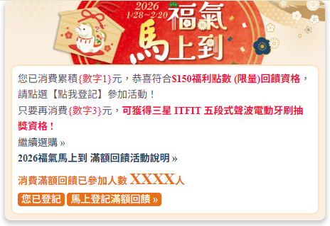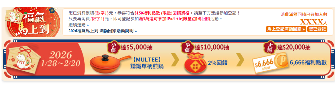 | 滿 $20,000 (含)以上抽【大福】 | $6,666福利點數 | 5 | 6,666 | 活動期間有登記且符合資格皆可參加 | 1個月 (實際依會員中心顯示為主) |
