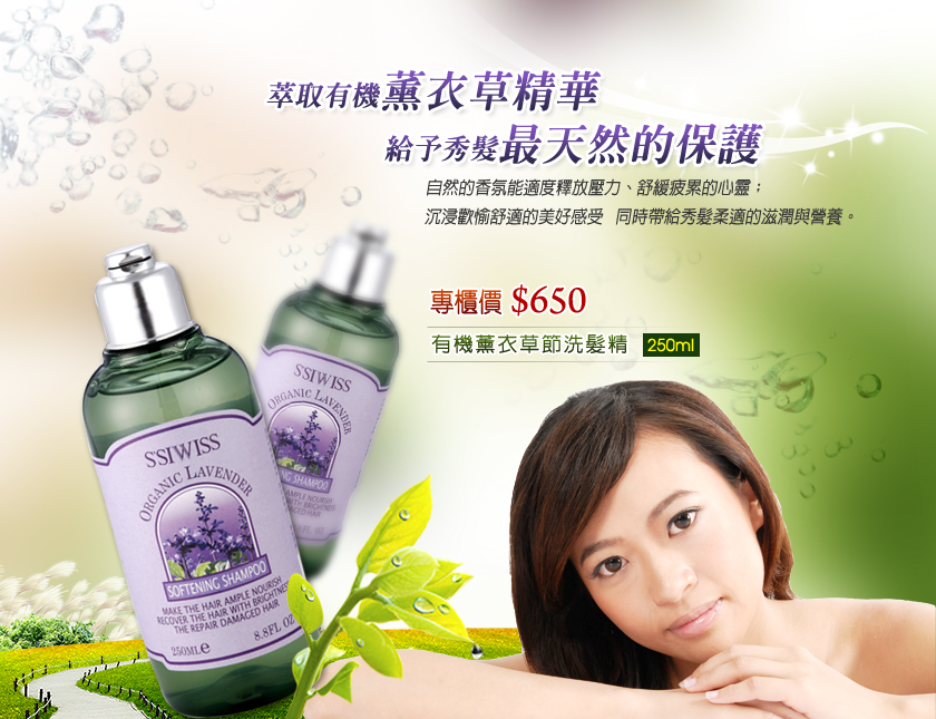 有機薰衣草精油溫和潔淨頭皮與髮絲,有益頭皮及髮絲的健康的滋養精華,增強頭髮結構,使頭髮更強韌,不易斷裂,徹底潔淨頭皮與頭髮,具高效保濕功效並具潤髮作用,使頭髮輕柔滑順、有彈性,能迅速帶給髮絲及頭皮充分的水分,使頭髮豐潤、光澤。天然植物菁華萃取,能充分補給受損髮極重要的水分,同時增加頭髮對抗氧化的保護力。它溫和的洗淨配方不僅能保護髮色,柔潤而細緻的泡沫,提供頭髮由裡而外的潤澤效果,帶給頭髮潔淨後的美麗光澤和彈力。富含薰衣草、蜂香薄荷及快樂鼠尾草精油等萃取物。